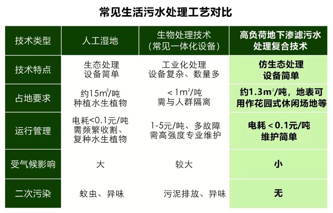 “高負荷地下滲濾技術”作為仿生態(tài)技術,在保留了“傳統(tǒng)地下滲濾”傳統(tǒng)地下滲濾主要優(yōu)點的同時,克服了生化處理技術設備多、能耗高、需要專業(yè)維護等主要缺點;同時又解決了生態(tài)處理技術占地面積大,冬季無法正常運行的重大缺陷。